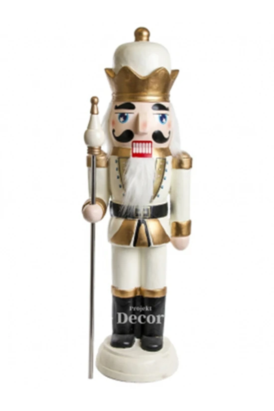 Ez az impozáns diótörő tökéletesen illik a karácsonyi dekoráció szívébe, és hatásosan mutat kandalló vagy karácsonyfa mellett is. A fehér alap és az arany akcentusok harmóniája bármely ünnepi színvilággal összhangban van, így minden belső térnek ragyogást kölcsönöz. Kiváló ajándékötlet lehet a diótörő rajongók és a karácsony szerelmesei számára, sőt, évszaktól függetlenül elegáns dekorációs elemként is megállja a helyét.